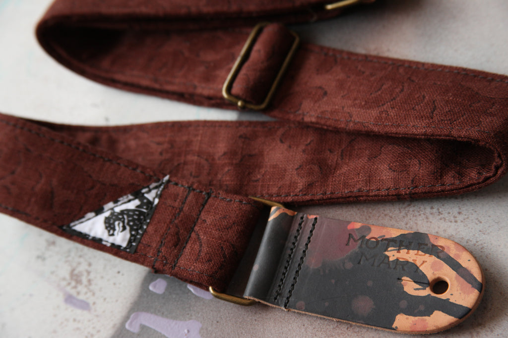 All of our guitar straps are made in Missouri close to home. They all feature metal buckles, as well as unique in-house hand dyed leather ends. Each leather end is one of a kind. Straps will have variants within each pattern/batch.